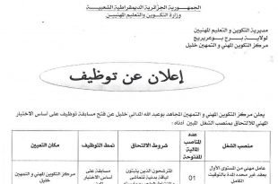 الجمهورية الجزائرية الديمقراطية الشعبية وزارة التكوين والتعليم المهنيين مديرية التكوين والتعليم المهنيين لولاية برج بوعريريج مركز التكوين المهني والتمهين المجاهد بوعبد الله المداني خليل ads إعلان عن توظيف يعلن مركز التكوين المهني والتمهين المجاهد بوعبد الله المداني خليل عن فتح مسابقة توظيف على أساس …