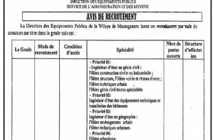 الجمهورية الجزائرية الديمقراطية الشعبية وزارة السكن و العمران و المدينة ولاية مستغانم مديرية التجهيزات العمومية مصلحة الإدارة و الوسائل ads إعلان عن توظيف تعلن مديرية التجهيزات العمومية لولاية مستغانم عن فتح مسابقة توظيف على اساس الشهادة في الرتبة التالية : منصب : مهندس دولة …