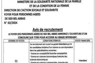 جمهورية الجزائر الديمقراطية الشعبية وزارة التضامن الوطني والأسرة وقضايا المرأة مديرية العمل الاجتماعي والتضامن دار الاشخاص المسنين بسيدي بلعباس ads إعلان عن مسابقة توظيف يعلن دار الاشخاص المسنين بسيدي بلعباس عن فتح مسابقة توظيف في الرتبة المبينة ادناه عدد المناصب: 01 شروط التوظيف: جميع …