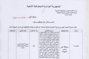 الجمهورية الجزائرية الديمقراطية الشعبية وزارة الصيد البحري والمنتجات الصيدية مديرية الصيد البحري وتربية المائيات لولاية بسكرة ads إعلان عن توظيف تعلن مديرية الصيد البحري وتربية مالائيات لولاية بسكرة عن فتح باب التوظيف على اساس الشهادة وعن طريق الانتقاء في المناصب التالية:. جميع مسابقات وإعلانات …