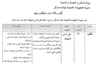 أكمل القراءة »إعلان عن توظيف بمديرية التجهيزات العمومية بولاية معسكر