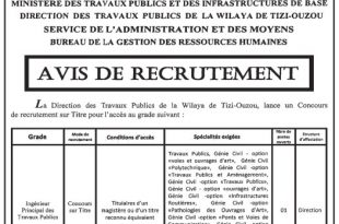 أكمل القراءة »إعلان عن مسابقة توظيف بمديرية الأشغال العمومية لولاية تيزي وزو