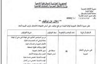 الجمهورية الجزائرية الديمقراطية الشعبية وزارة الأشغال العمومية والمنشآت القاعدية مديرية الأشغال العمومية لولاية البليدة مصلحة الإدارة والوسائل مكتب تسيير الموارد البشرية ads إعلان عن توظيف تعلن مديرية الأشغال العمومية لولاية البليدة عن فتح توظيف على أساس الشهادة للالتحاق بالرتب المبينة أدناه: ملف الترشح: يحتوي …