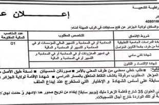 الجمهورية الجزائرية الديمقراطية الشعبية وزارة التربية الوطنية مديرية التربية لولاية الشلف مصلحة التمدرس والامتحانات ads إعلان تعلن مديرية التربية لولاية الشلف عن فتح مسابقات توظيف خاصة بالعمال المهنيين حسب الرتب والاختصاصات على أساس الاختبار، حيث خصصت لهذا الغرض مراكز استقبال ملفات الترشح موزعة جغرافيا …