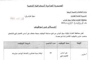 الجمهورية الجزائرية الديمقراطية الشعبية وزارة الفلاحة والتنمية الريفية المديرية العامة للغابات محافظة الغابات لولاية سوق أهراس ads سوق أهراس في 30/10/2024 إعلان عن توظيف تعلن محافظة الغابات لولاية سوق أهراس عن فتح مسابقة توظيف بصفة متعاقد على أساس الاختبار المهني للالتحاق بمنصب عامل مهني …