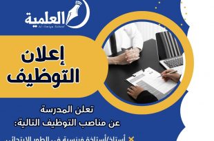 إعلان توظيف المدرسة العلمية .Al ilmiya school ads تعلن مدرسة العلمية عن توفر فرص عمل في التخصصات التالية: أستاذ/أستاذة فرنسية في الطور الابتدائي أستاذ/أستاذة إنجليزية في الطور الثانوي (هناك مساحة فارغة لذكر تخصصات أخرى) مساعد إداري في الطور الابتدائي (للذكور) للتواصل: الهاتف: 0561725440 البريد …