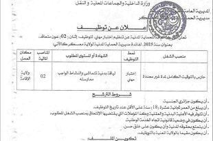 وزارة الداخلية والجماعات المحلية والتهيئة العمرانية المديرية العامة للحماية المدنية مديرية الحماية المدنية لولاية معسكر ads إعـلان عن تـوظـيـف تعلن المديرية العامة للحماية المدنية عن تنظيم إختبار مهني، لتوظيف: إثنان (02) عون متعاقد، بعنوان سنة 2025، لفائدة مديرية الحماية المدنية لولاية معسكر كالآتي: منصب …