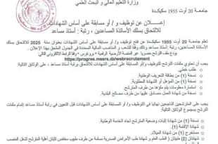 وزارة التعليم العالي والبحث العلمي جامعة 20 أوت 1955 سكيكدة ads إعـــــلان عن توظيف و / أو مسابقة على أساس الشهادات للالتحاق بسلك الأساتذة المساعدين ، رتبة : أستاذ مساعد تعلم جامعة 20 أوت 1955 سكيكدة عن فتح توظيف و/ أو مسابقة على أساس …