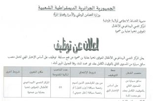 الجمهورية الجزائرية الديمقراطية الشعبية وزارة التضامن الوطني والأسرة وقضايا المرأة مديرية النشاط الاجتماعي لولاية غرداية المركز النفسي البيداغوجي للأطفال المعوقين ذهنيا ضاية بن ضحوة ads إعلان عن توظيف يعلن المركز النفسي البيداغوجي للأطفال المعوقين ذهنيا بضاية بن ضحوة عن فتح مسابقة توظيف على أساس …