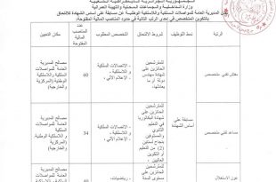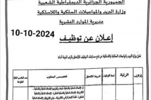 الجمهورية الجزائرية الديمقراطية الشعبية وزارة البريد والمواصلات السلكية واللاسلكية مديرية الموارد البشرية ads إعلان عن توظيف تعلن وزارة البريد والمواصلات السلكية واللاسلكية عن فتح مسابقات التوظيف للإلتحاق بالرتب المبينة أدناه: مهندس دولة لتكنولوجيات الإعلام و الإتصال 08 مناصب مهندس دولة في الإعلام الآلي 05 …