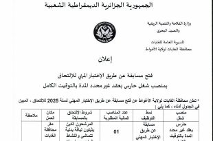وزارة الفلاحة والتنمية الريفية والصيد البحري المديرية العامة للغابات محافظة الغابات لولاية الأغواط ads إعلان فتح مسابقة عن طريق الاختبار المهني للالتحاق بمنصب شغل حارس بعقد غير محدد المدة بالتوقيت الكامل تعلن محافظة الغابات لولاية الأغواط عن فتح مسابقة عن طريق الاختبار المهني لسنة …