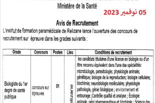 اعلان عن توظيف معهد التكوين شبه الطبي غليزان ads تعلن معهد التكوين شبه الطبي غليزان عن فتح مسابقة توظيف في الرتب المبينة ادناه بيولوجي في الصحة العمومية من الدرجة الاولى عدد المناصب 01 منصب نمط التوظيف: مسابقة على اساس الشهادة محاسب اداري رئيسي عدد …