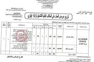 وزارة العمل والتشغيل والضمان الاجتماعي الوكالة الوطنية للتشغيل الفرع الولائي للتشغيل ايليزي ads إيليزي، في 13-05-2024 عرض عمل توزيع عروض العمل على المكاتب البلدية للتشغيل لولاية إيليزي عرض عمل المؤسسة الوطنية البترولية للأشغال الكبرى، المتعلق بمشروع TINHERT، والذي يتضمن شغل 85 منصبا مختلفا. بنشر …