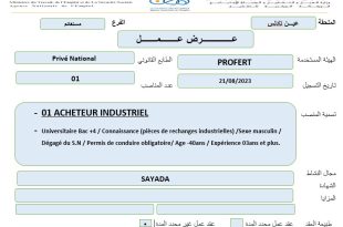 الفرع الولائي للتشغيل مستغانم الملحقة المحلية للتشغيل عين تادلس مستغانم عرض عمل مؤسسة PROFERT ads تعلن الملحقة المحلية للتشغيل عين تادلس مستغانم عن عرض عمل بمؤسسة PROFERT كما هو موضح ادناه الهيئة المستخدمة مؤسسة PROFERT المناصب المطلوبة ACHETEUR INDUSTRIEL عدد المناصب 01 مكان العمل …