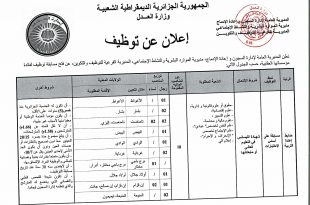 الجمهورية الجزائرية الديمقراطية الشعبية وزارة العدل المديرية العامة لإدارة السجون وإعادة الإدماج ads إعلان عن توظيف تعـلن المديرية العامة لإدارة السجون وإعادة الإدماج، مديرية الموارد البشرية والنشاط الاجتماعي، المديرية الفرعية للتوظيف والتكوين، عن فتح مسابقة توظيف لفائدة مؤسساتها العقابية، حسب الجدول الآتي: الرتبةالشعبة …