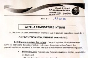 أكمل القراءة »اعلان توظيف بالمؤسسة العمومية الجزائرية للمياه في التخصص التالي: