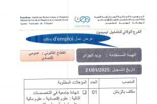 الجمهورية الجزائرية الديمقراطية الشعبية وزارة العمل والتشغيل والضمان الاجتماعي الوكالة الوطنية للتشغيل الفرع الولائي للتشغيل تيميمون ads عرض عمل الهيئة المستخدمة : بريد الجزائر القطاع الاقتصادي : عمومي تاريخ التسجيل : 21/01/2025 المؤهلات المطلوبةالعددالمنصب– شهادة جامعية في التخصصات التالية : علوم اقتصادية ، علوم …