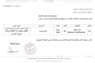الملحقة المحلية للتشغيل أم العظائم الفرع الولائي للتشغيل سوق أهراس ads عرض عمل المؤسسة : شركة كوسيدار تاريخ تسجيل العرض: 21/07/2025 مكان العمل: أم العظائم اسم المهنة: COFFREUR الخبرة المطلوبة: عام (01) خبرة مهنية محدد المدة: . عدد المناصب: 10 إعلان عن توظيف بالمجلس …