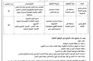 اعلان توظيف المؤسسة العمومية الاستشفائية البيض اكتوبر 2019 يعلن السيد مدير المؤسسة العمومية الاستشفائية بالابيض سيدي الشيخ عن فتح مسابقة للتوظيف في الرتب المبينة ادناه طبيب عام في الصحة الجوارية نمط التوظيف مسابقة على اساس الشهادة شروط الالتحاق شهادة دكتور في الطب او شهادة …