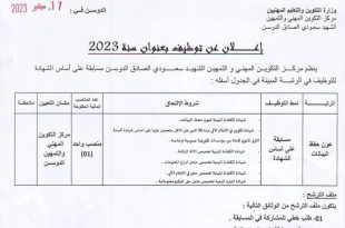اعلان توظيف مركز التكوين المهني والتمهين الشهيد سعودي الصادق الدوسن ads يعلن مركز التكوين المهني والتمهين الشهيد سعودي الصادق الدوسن عن فتح مسابقة توظيف على اساس الشهادة في الرتب المبينة ادناه عون حفظ البيانات عدد المناصب 01 منصب نمط التوظيف: مسابقة على اساس الشهادة …