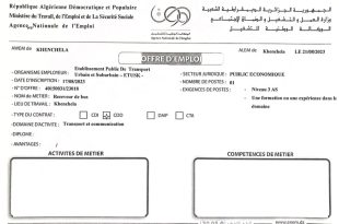 الفرع الولائي للتشغيل خنشلة الملحقة المحلية للتشغيل خنشلة عرض عمل مؤسسة النقل ETUSK ads تعلن الملحقة المحلية للتشغيل خنشلة عن عرض عمل بمؤسسة النقل ETUSK كما هو موضح ادناه الهيئة المستخدمة مؤسسة النقل ETUSK المناصب المطلوبة receveur de bus عدد المناصب 01 مكان العمل …