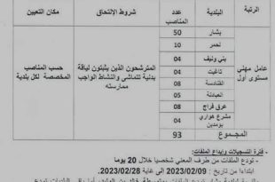 اعلان عن توظيف مديرية التربية لولاية بشار ads تعلن مديرية التربية لولاية بشار عن فتح مسابقة توظيف على اساس الاختبار المهني في الرتب المبينة ادناه عامل مهني من المستوى الاول عدد المناصب 93 منصب نمط التوظيف مسابقة على اساس الاختبار المهني المترشحون الذين يثبتون …