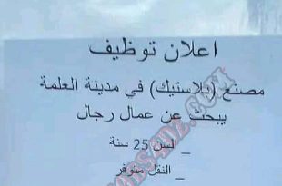 اعلان عن توظيف مصنع للبلاستيك ads مصنع بلاستيك في مدينة العلمة يبحث عن عمال رجال السن على الاقل 25 سنة النقل متوفر اوقات العمل بنظام 2/8 من 16.00 الى 14.00 ومن 14.00 الى 22.00 الخبرة غير مطلوبة رقم الهاتف 0797482888 تلغرام مسابقات التوظيف مسابقات …