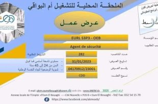 الملحقة المحلية للتشغيل ام البواقي عرض عمل مؤسسة EURL S3 P3 OEB ads تعلن الملحقة المحلية للتشغيل ام البواقي عن عرض عمل بمؤسسة EURL S3 P3 OEB كما هو موضح ادناه الهيئة المستخدمة مؤسسة EURL S3 P3 OEB المناصب المطلوبة Agent de sécurité عدد …