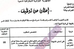 اعلان عن توظيف المديرية الولائية للضرائب باتنة ads تعلن المديرية الولائية للضرائب باتنة عن فتح مسابقة توظيف على اساس الشهادة في الرتب المبينة ادناه مفتش رئيسي للضرائب عدد المناصب 05 منصب نمط التوظيف مسابقة على اساس الشهادة ملف المسابقة على أساس الشهادة طلب خطي …