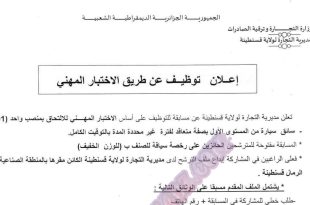 اعلان عن توظيف مديرية التجارة لولاية قسنطينة ads تعلن مديرية التجارة لولاية قسنطينة عن فتح مسابقة توظيف على اساس الاختبار المهني في الرتب المبينة ادناه سائق سيارة من المستوى الأول عدد المناصب 01 منصب نمط التوظيف مسابقة على اساس الاختبار المهني المتحصلين على رخصة …