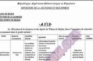 اعلان توظيف بمديرية الشباب والرياضة لولاية بجاية