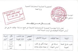 أكمل القراءة »اعلان توظيف بالمؤسسة العمومية الاستشفائية للقليعة تيبازة