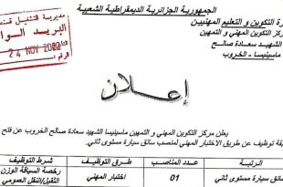 اعلان عن توظيف مركز التكوين المهني والتمهين ماسينيسا الخروب ads يعلن مركز التكوين المهني والتمهين ماسينيسا الخروب عن فتح مسابقة توظيف عن طريق الاختبار المهني في الرتب المبينة ادناه سائق سيارة مستوى ثاني عدد المناصب 01 نمط التوظيف عن طريق الاختبار المهني ملف مسابقة …