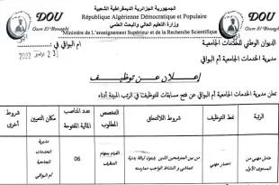 اعلان عن توظيف مديرية الخدمات الجامعية ام البواقي ads تعلن مديرية الخدمات الجامعية ام البواقي عن فتح مسابقة توظيف على اساس الاختبار المهني في الرتب المبينة ادناه عامل مهني من المستوى الاول عدد المناصب 06 نمط التوظيف على اساس الاختبار المهني ملف مسابقة على …