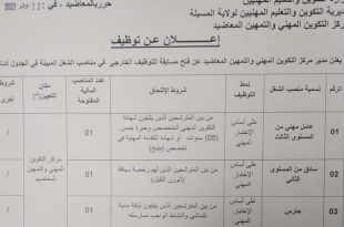 اعلان عن توظيف مركز التكوين المهني والتمهين المعاضيد ولاية المسيلة ads يعلن مركز التكوين المهني والتمهين المعاضيد ولاية المسيلة عن فتح مسابقة توظيف على اساس الاختبار المهني في الرتب المبينة ادناه عامل مهني من المستوى الثالث عدد المناصب 01 نمط التوظيف على اساس الاختبار …