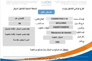 عرض عمل مؤسسة كوسيدار COSIDER POLE C 01 تيارت ads تعلن الملحقة المحلية للتشغيل السوقر عن عرض عمل بمؤسسة كوسيدار COSIDER POLE C 01 تيارت كما هو موضح ادناه الهيئة المستخدمة مؤسسة كوسيدار COSIDER POLE C 01 تيارت المنصب المطلوب Manoeuvre de chantier مكان …