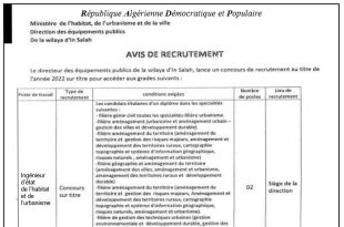 اعلان عن توظيف اعلان توظيف بمديريةالتجهيزات العمومية لولاية عين صالح تعلن مديريةالتجهيزات العمومية لولاية عين صالح عن فتح مسابقة توظيف على اساس الشهادة في الرتب المبينة ادناه مهندس دولة في السكن و العمران عدد المناصب 02 نمط التوظيف مسابقة على اساس الشهادة ملف المسابقة …