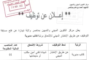 أكمل القراءة »توظيف أساتذة واداريين بمديريات التكوين والتعليم المهني لعدة ولايات