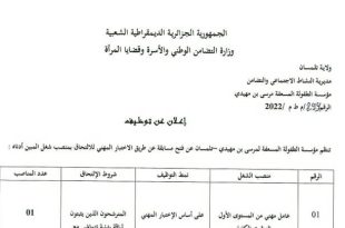 اعلان عن توظيف مؤسسة الطفولة المسعفة لمرس بن مهيدي تلمسان ads تعلن مؤسسة الطفولة المسعفة لمرس بن مهيدي تلمسان عن فتح مسابقات توظيف على اساس الاختبار المهني في الرتب المبينة ادناه عامل مهني من المستوى الاول بالتوقيت الكامل عدد المناصب 01 نمط التوظيف مسابقة …