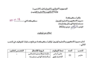 أكمل القراءة »اعلان عن توظيف بمديرية التكوين والتعليم المهنيين لولاية سكيكدة