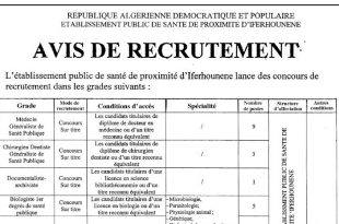 اعلان عن توظيف المؤسسة العمومية للصحة الجوارية إفرحونان ولاية تيزي وزو ads تعلن المؤسسة العمومية للصحة الجوارية إفرحونان ولاية تيزي وزو عن فتح مسابقات توظيف على اساس الشهادة في الرتب المبينة ادناه طبيب عام في الصحة العمومية عدد المناصب 09 نمط التوظيف مسابقة على …