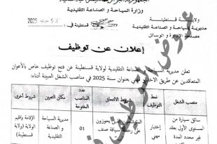 وزارة السياحة والصناعة التقليدية مديرية السياحة والصناعة التقليدية ولاية قسنطينة مصلحة الادارة والوسائل ads إعلان عن توظيف تعلن مديرية السياحة والصناعة التقليدية لولاية قسنطينة عن فتح توظيف خاص بالأعوان المتعاقدين عن طريق الاختبار المهني بعنوان سنة 2025 في المناصب الشغل المبينة أدناه: منصب الشغل: …
