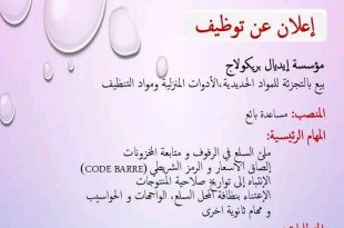 إعلان عن توظيف مؤسسة إيديال بريكولاج ads بيع بالتجزئة للمواد الحديدية، الأدوات المنزلية ومواد التنظيف المنصب: مساعدة بائع المهام الرئيسية: ملئ السلع في الرفوف و متابعة المخزونات الصاق الأسعار و الرمز الشريطي (CODE BARRE) الانتباه إلى تواريخ صلاحية المنتوجات الإعتناء بنظافة المحل السلع، الواجهات …