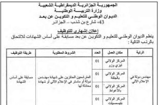 اعلان عن توظيف الديوان الوطني للتعليم والتكوين عن بعد ads يعلن الديوان الوطني للتعليم والتكوين عن بعد عن فتح توظيف على اساس الشهادة بالولايات التالية تيزي وزو الجلفة الاغواط تيسمسيلت في الرتب المبينة ادناه مهندس دولة في الاعلام الالي عدد المناصب 04 مناصب بمعدل …