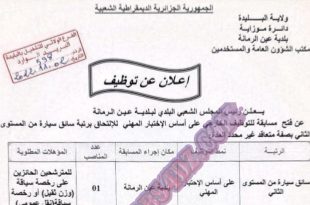 اعلان عن توظيف المجلس الشعبي البلدي لبلدية عين الرمانة البليدة ads يعلن رئيس المجلس الشعبي البلدي لبلدية عين الرمانة البليدة عن فتح توظيف على اساس الاختبار المهني في الرتب المبينة ادناه سائق سيارة من المستوى الثاني عدد المناصب 01 نمط التوظيف على اساس الاختبار …