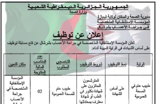 اعلان عن توظيف المؤسسة العمومية الاستشفائية المتخصصة في جراحة الاعصاب بشرشال ولاية تيبازة ads تعلن المؤسسة العمومية الاستشفائية المتخصصة في جراحة الاعصاب بشرشال ولاية تيبازة عن فتح توظيف على اساس الشهادة في الرتب المبينة ادناه طبيب عام في الصحة العمومية عدد المناصب 02 نمط …