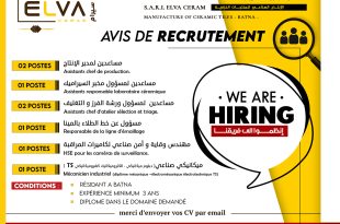 اعلان عن توظيف ELVA CERAM إلفــــا سيـــــرام ads تعلن سركة ELVA CERAM إلفــــا سيـــــرام المتخصة في الانتاج الصناعي للمنتجات الخزفية عن فتح توظيف في الرتب المبينة ادناه مساعدين لمدير الانتاج عدد المناصب 02 مساعدين لمسؤول مخبر السيراميك عدد المناصب 01 مساعدين لمسؤول ورشة الفرز …