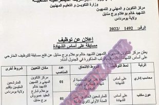 أكمل القراءة »اعلان عن توظيف بمركز التكوين المهني والتمهين الشهيد خالم بوعلام برج منايل