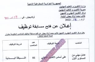 اعلان عن توظيف مركز التكوين المهني والتمهين طالب محمد اولاد يعيش البليدة ads يعلن مركز التكوين المهني والتمهين طالب محمد اولاد يعيش البليدة عن فتح توظيف على اساس الاختبار المهني في الرتب المبينة ادناه عامل مهني من المستوى الاول عدد المناصب 01 نمط التوظيف …