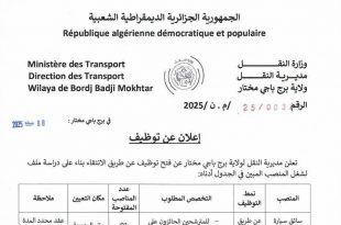 أكمل القراءة »إعلان عن توظيف في مديرية النقل لولاية برج باجي مختار